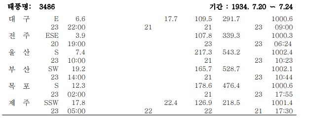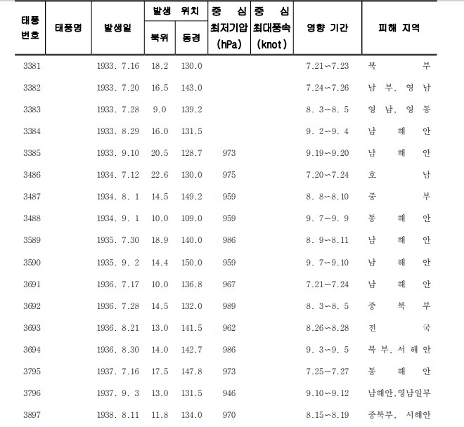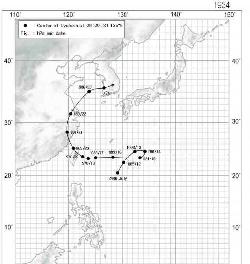1934년 한반도 남쪽에 폭우를 몰고 온 태풍 3486호 이때까정 태풍에 정식 명칭이 없었지 싶습니다.