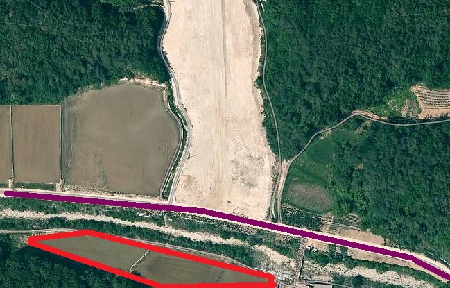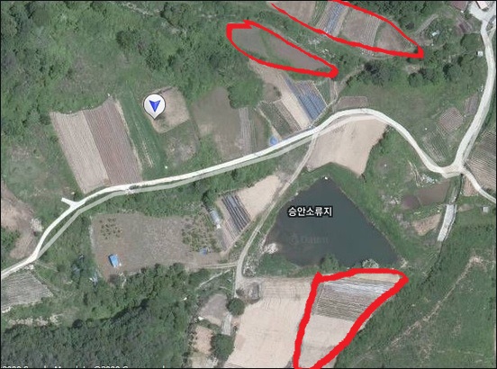 위 이미지를 보시면 보라색으로 표시된 현황도로가 있고 아래 쪽 붉은 선 안으로 표시된 땅이 있는데 그 사이를 가로지르고 있는 하천이 있습니다.