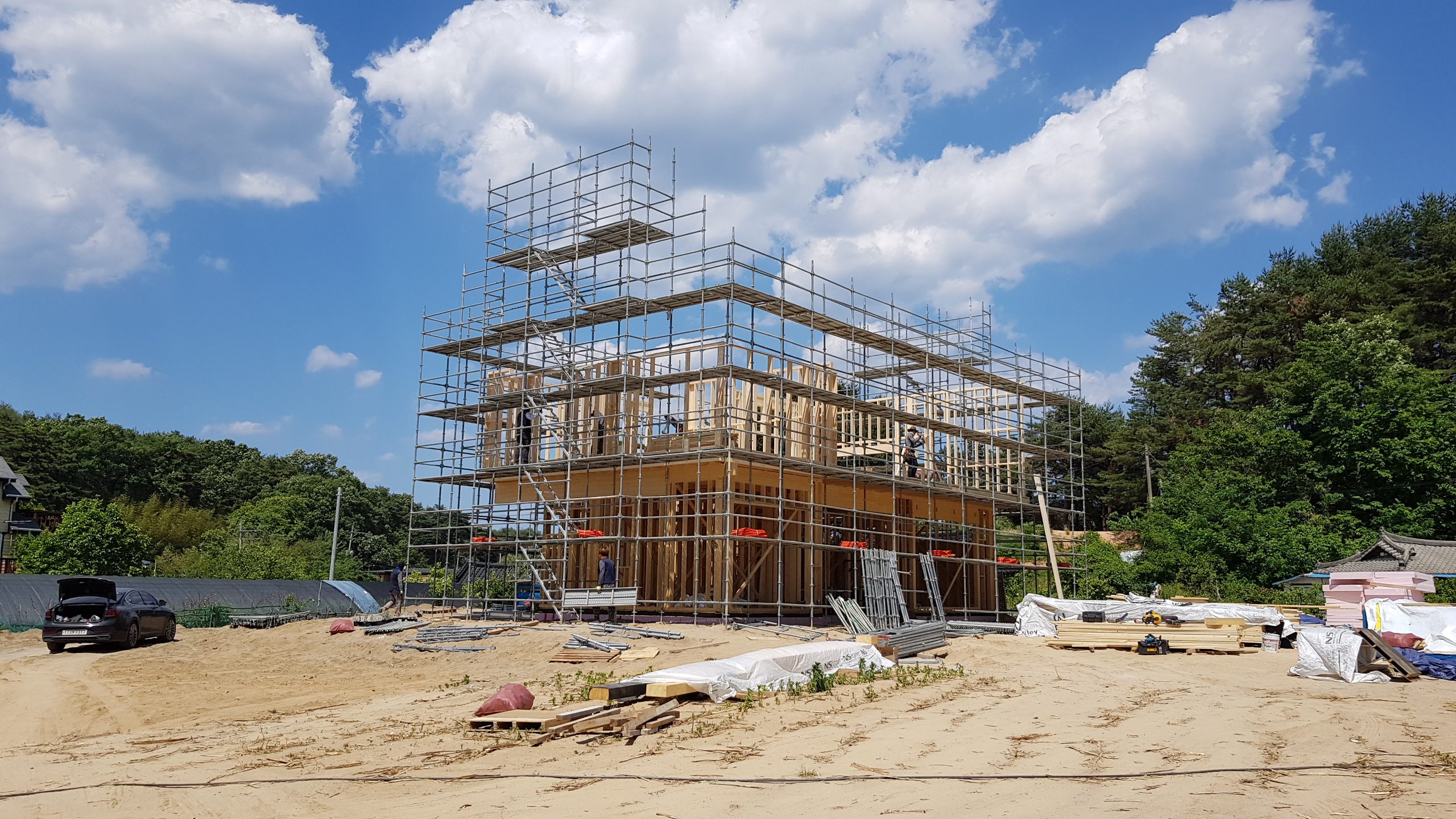 골조가 올라가는 모습. 중목구조로 계획했지만 건축비를 조금이라도 줄이고자 경량 목구조로 바꾸었다ㅠ