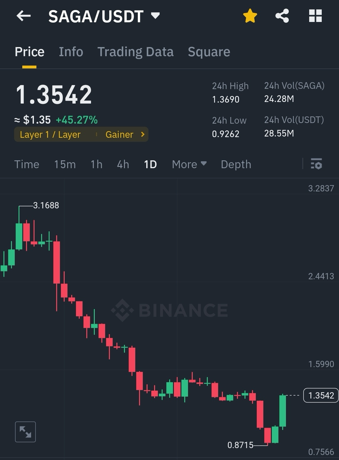 설렜다...skuld2000 (80)in #kr • 2 years ago 요즘 거래소 앱 자체를 잘 안열어 보는데요. 근데 조금 전에 바낸에 들어가보니 SAGA 가 무려 45% 떡상 중이더군요. 오, 왠일이지 하고 일봉으로 바꿔보니.. 하... 걍 며칠 전 가격일뿐... 몇 토막 난거 복구는 언감생심이군요. #krsuccess #saga