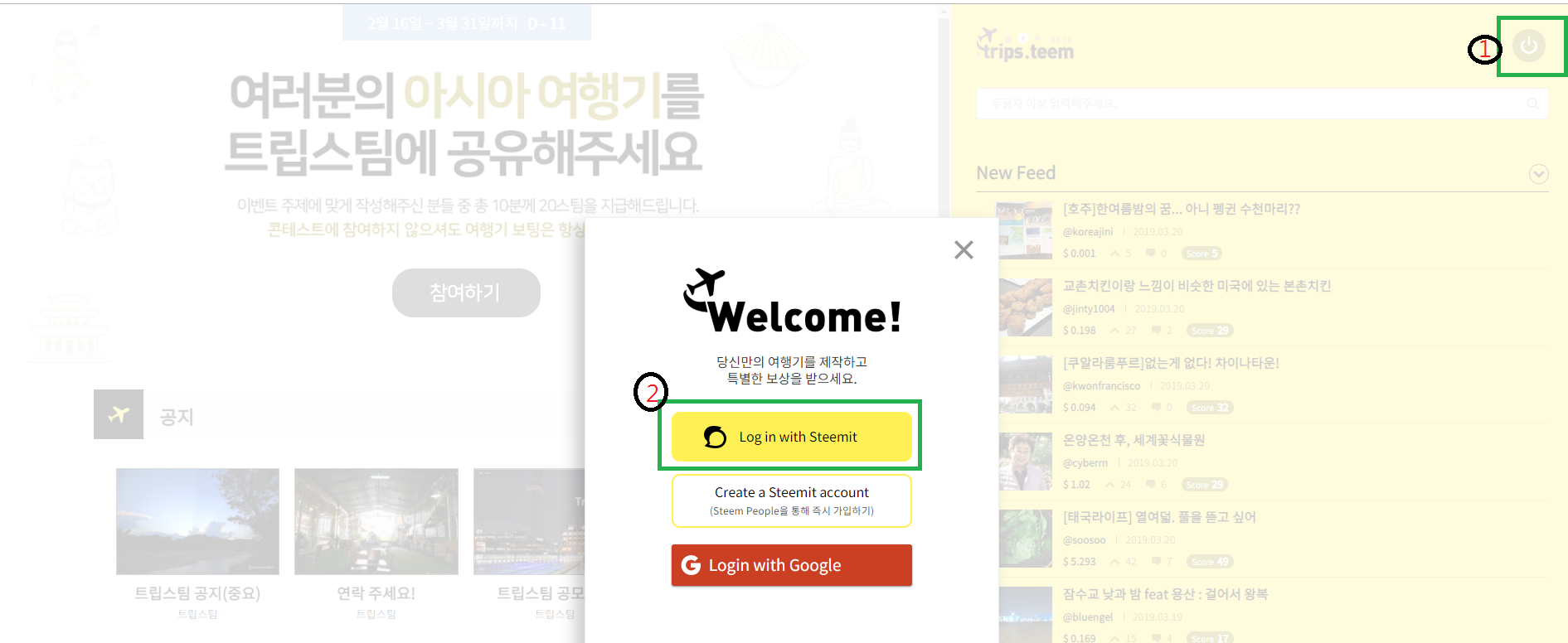 위 그림에 나오듯 1번 2번 순으로 로그인 하시면 됩니다. 트립스팀 또한 여행지 관련 포스팅에 있어 보팅 받을 수 있는 보상이 큽니다 이왕 여행관련 글이라면 이곳에서 포스팅 하시는걸 추천 드립니다.
