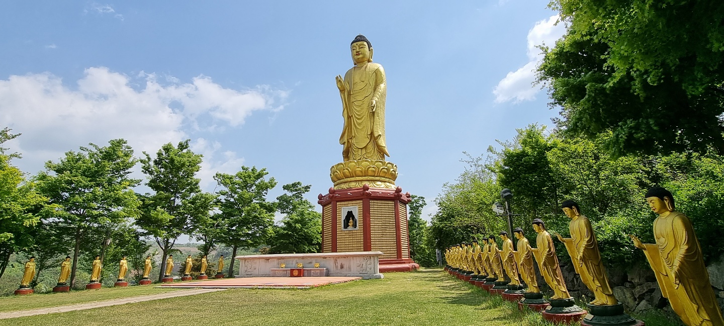 허공에 떠 영취산을 찾아왔다. 그들은 연꽃에서 내려와 부처님
