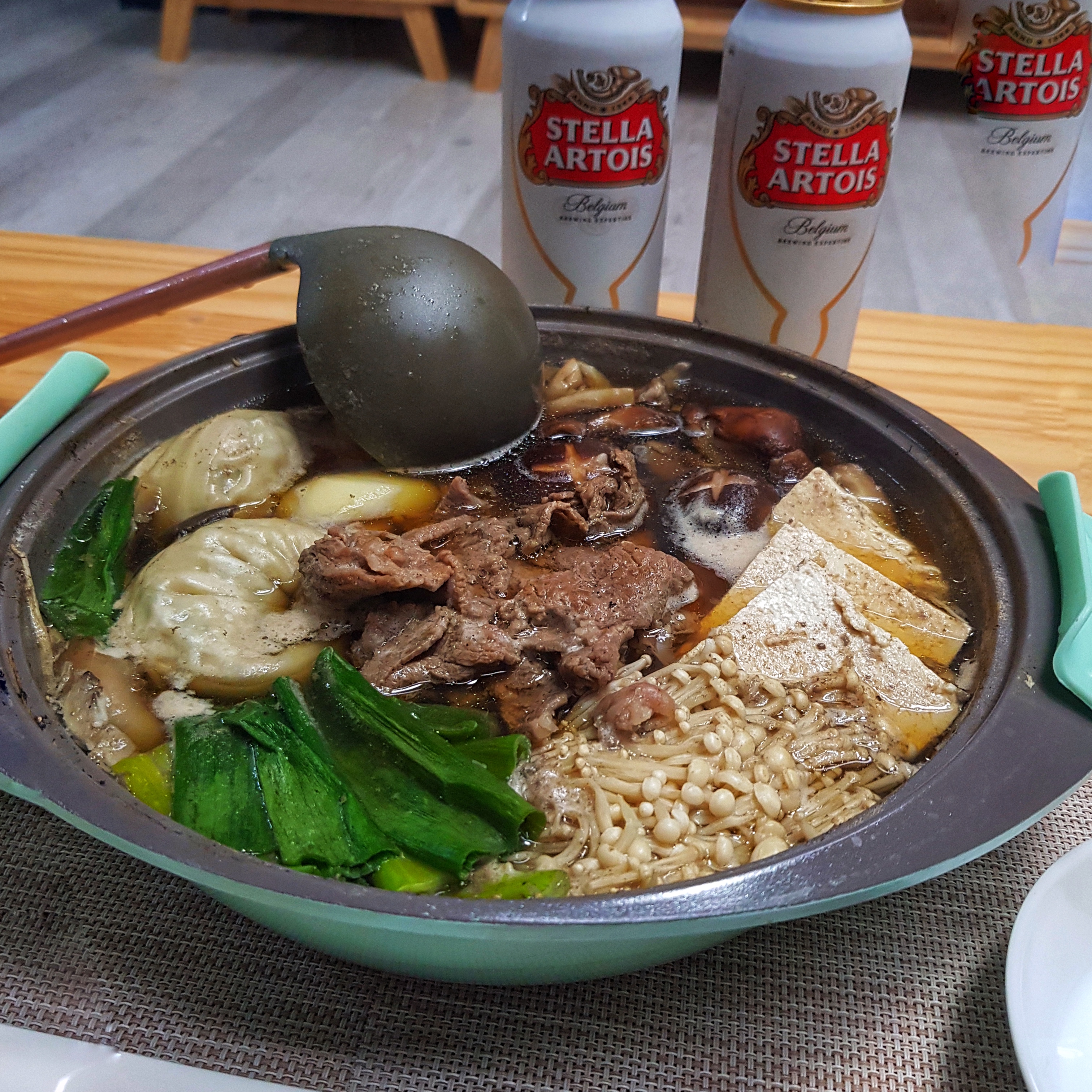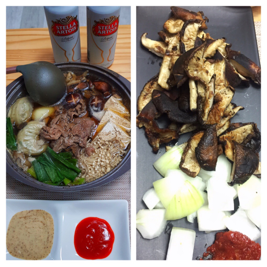한시간 육수를 쭉 뽑은 뒤, 전골냄비에 집에 남은 야채, 만두, 판두부, 버섯 넣은 뒤 가운데에 소고기를 뙇.