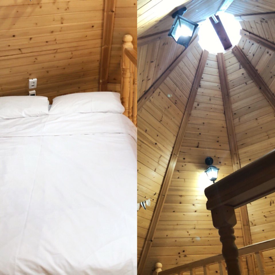방은 복층 구조이고, 천장이 저렇게 뚫여 있어 채광이 좋아 퇴실 시간 놓칠 일이 없습니다.