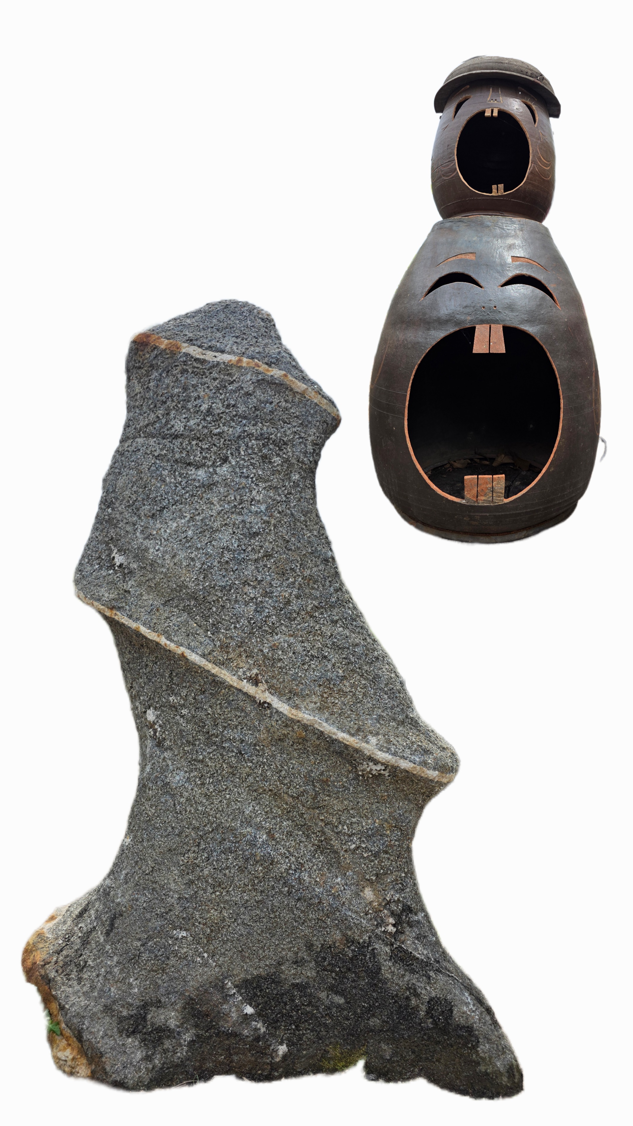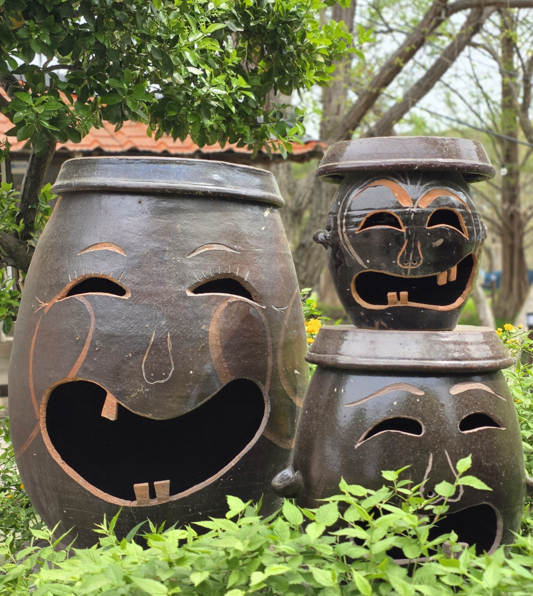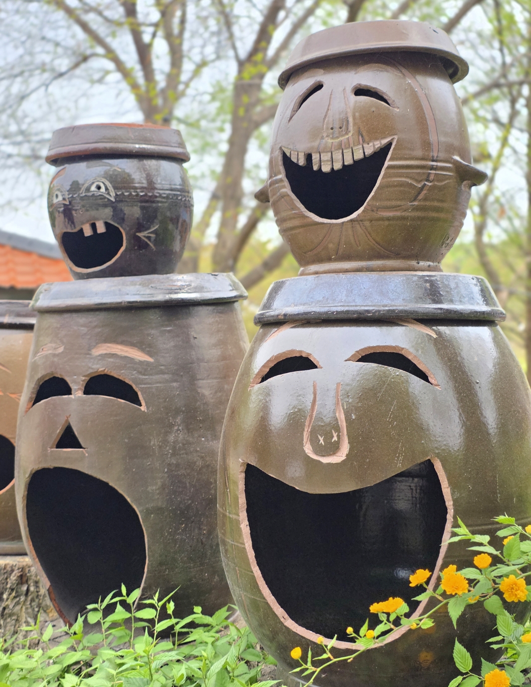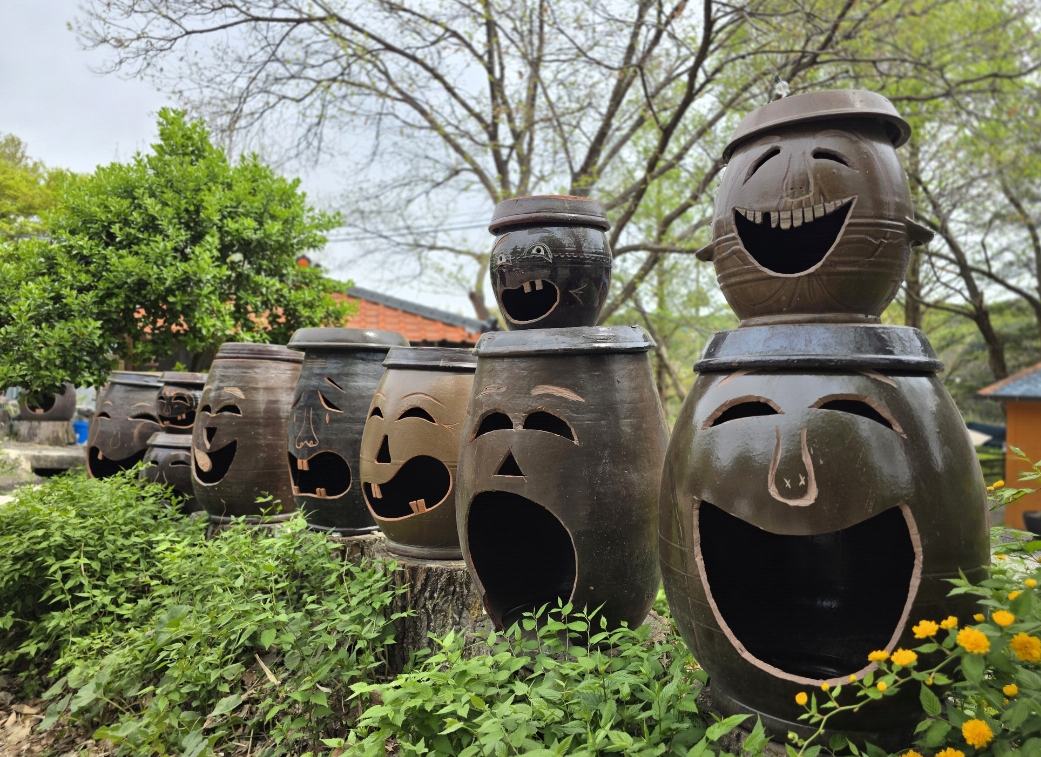 이곳 식당은 시골에 위치하여 정원을 나름 예쁘게 꾸며 놓았네요. 특히 장단지를 그라인드로 파내고 갈아서 여러가지 표정과 감정을 담아 얼굴 조각상을 해 놓았는데 재미가 있네요. 찡그린 얼굴보다 환하게 웃는 표정이 왠지 정이 갑니다. 밤에 보면 좀 무서울것 같긴 합니다. ㅎ