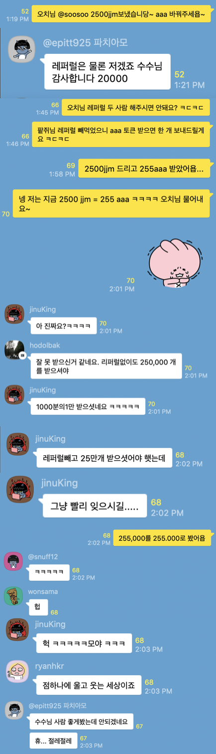 SCT를 열심히 파는데 사실 코인이 주제라는 한계가 있어서 할 말이 많이 없지만 주변 이야기들을 열심히 하다가 문화컨텐츠를 주제로 하는 AAA가 나온다기에 요것도 좀 구해놔야겠다싶어 갖고 있던 절반의 JJM 2500개를 오치님께 부탁드렸는데 세상에! AAA 255개가 온겁니다. 아무리 몰라도 가격은 JJM이 훨씬 높다고 알고 있었기에 단톡에 바로 항의를 하면서 보낼 수 있는 땡깡시리즈 이모티콘은 다 보냈습니다. 그리고 이 전투에 많은 분들이 참전하셨습니다. 하지만 255,000을 255.000로 착각한 것이었음을 발견하는데는 별로 오래 걸리지 않았죠. 저는 바로 사과말씀을 전달하고 그 자리에 계셨던 분들께 사과 및 재미의 뜻으로 10개씩 나눠드리기로 했습니다. 25만개. 아웅. 마음이 넉넉해질 수 밖에 없는 숫자 아니겠습니까.