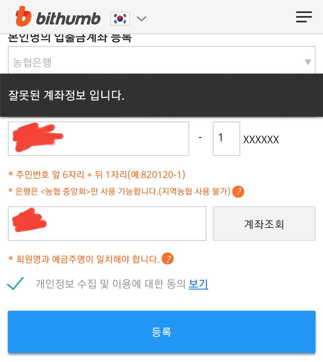 소생을 시키고 다시 돌아온 내자리에서 이제 빗썸에 계좌등록을 해봅니다.