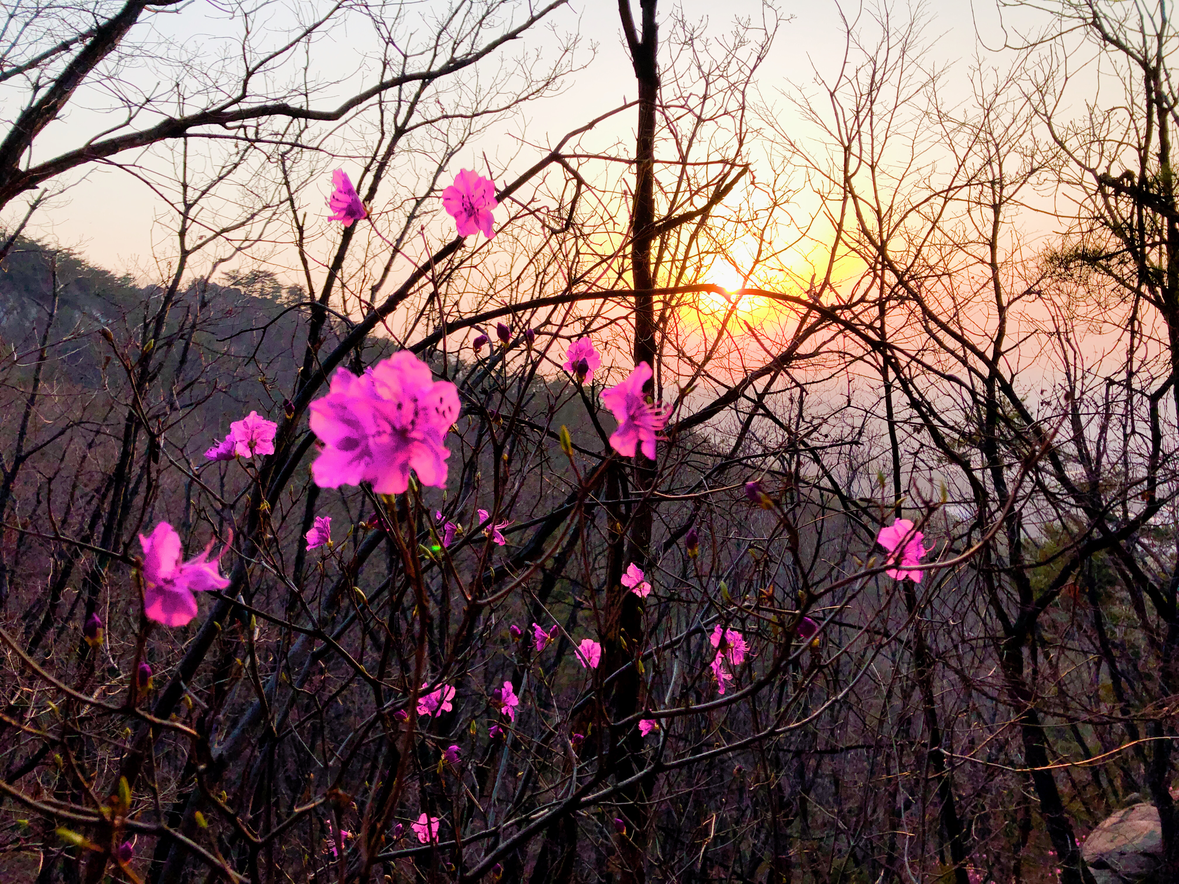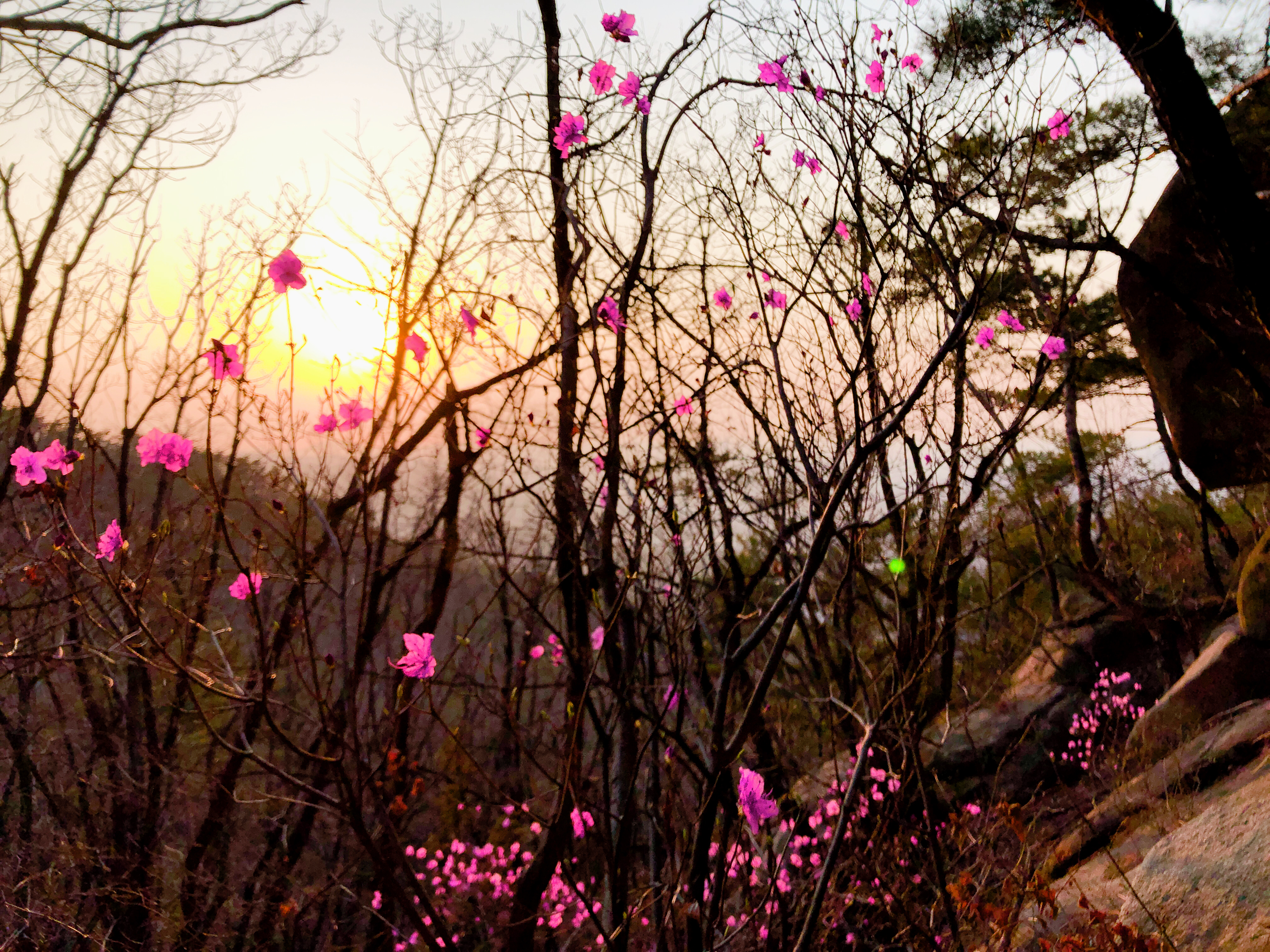 노을 빛에 물든 진달래 모습이 참 이쁘지요. 조금 힘든시기일 수록 긍정적이고 이쁜 소식이 힘이 됩니다. 이번주말 시회적 거리두기를 하면서 진달래 향기 밑아보시면 좋으실것 같습니다.