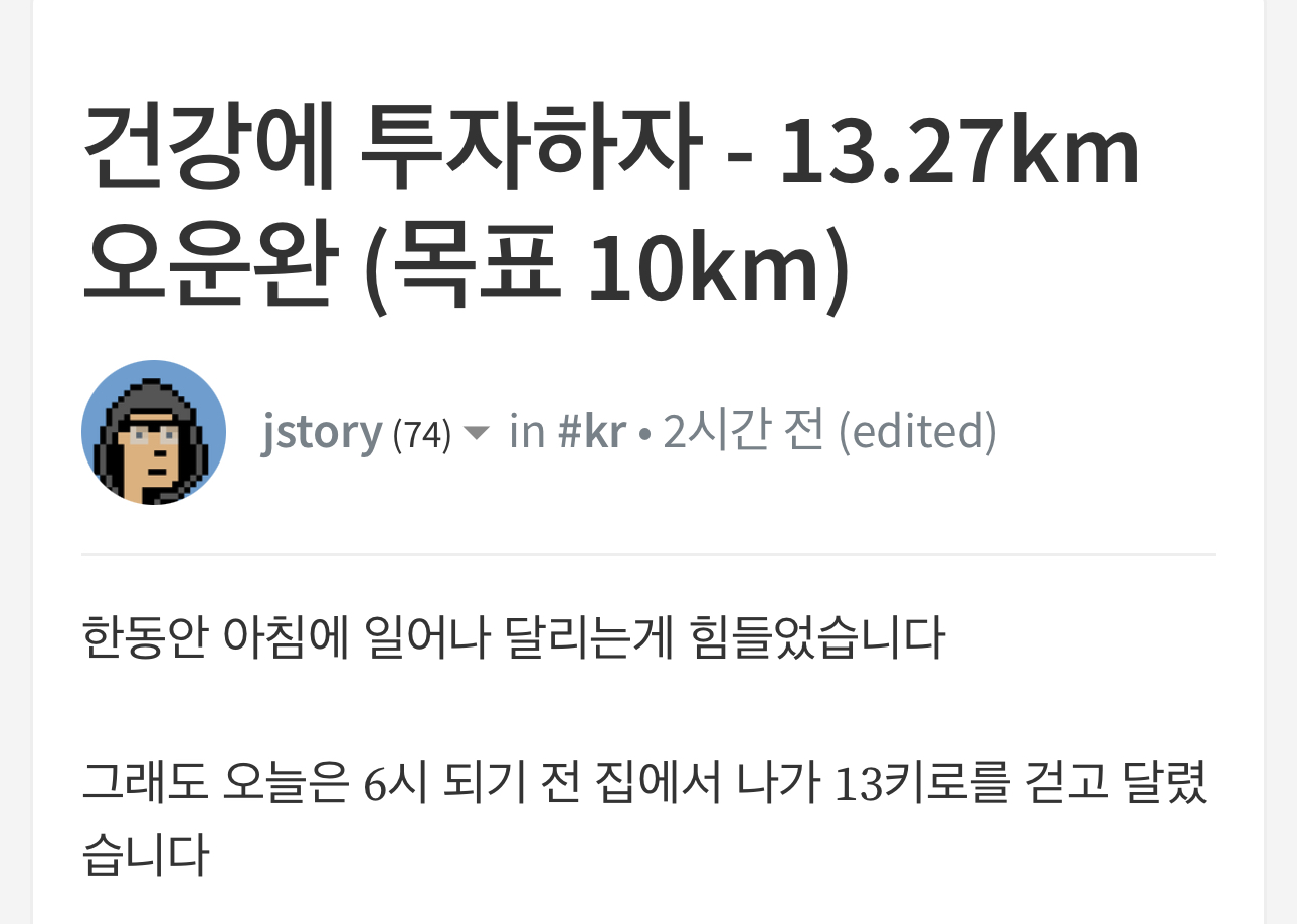 - 운동한 km수와 본인의 목표 수치를 제목에 표시하고 운동 결과(km수와 시간/속도)가 나오는 결과 그림을 본문에 포함