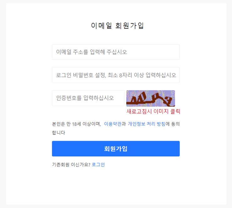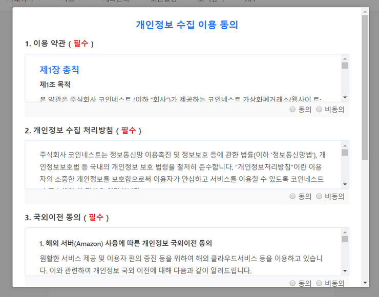 대한민국 거래소답게 성인이며, 운영 방침에 동의하는지를 묻습니다.