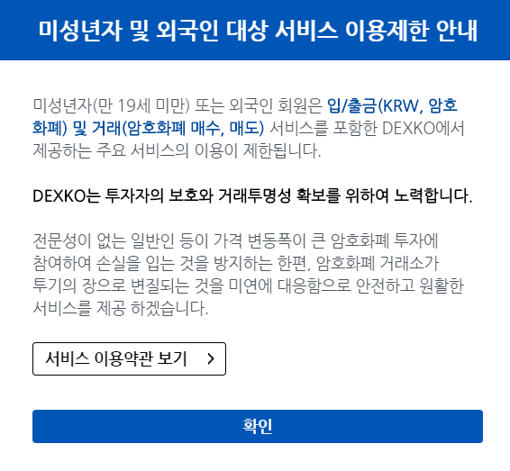 미성년자(만 19세 미만) 또는 외국인 회원은 입/출금(KRW, 암호화폐) 및 거래(암호화폐 매수, 매도) 서비스를 포함한 DEXKO에서 제공하는 주요 서비스의 이용이 제한됩니다.