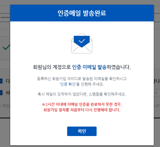 2시간 이내에 이메일 인증을 완료하지 못한 경우, 회원 가입 절차를 처음부터 다시 진행해야 합니다.