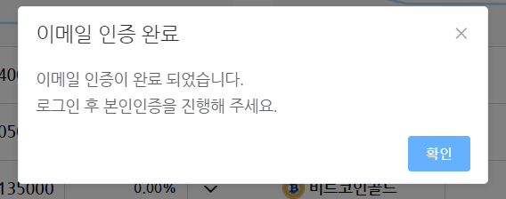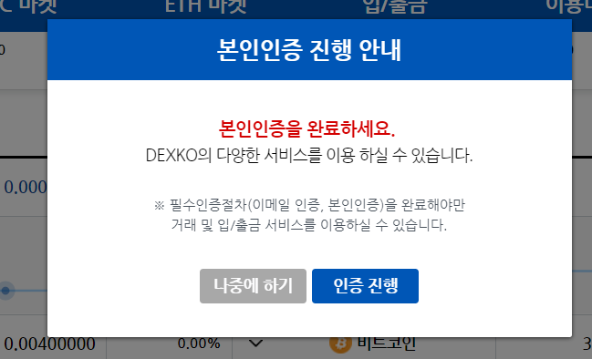 필수인증절차(이메일 인증, 본인인증)을 완료해야만 거래 및 입/출금 서비스를 이용하실 수 있습니다.