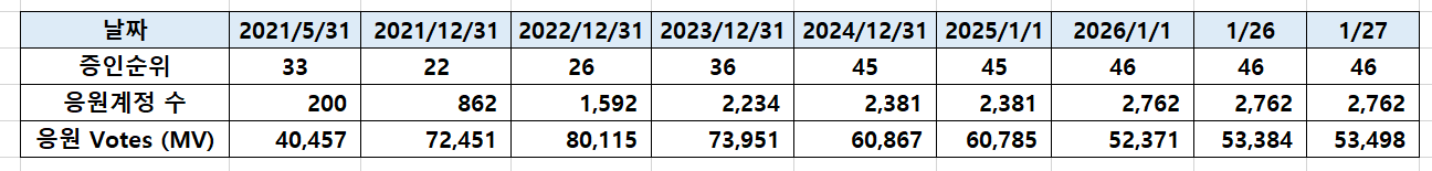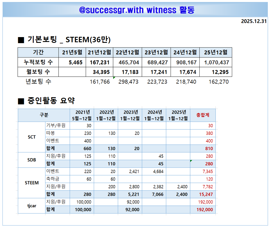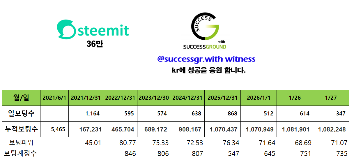 [260127] @successgr.with witness 활동실적successgr.with (75)in #kr • 3 months ago [기본보팅 ] 일 1회 krsuccess 태그를 사용하신 분들께 보팅합니다. KR에 성공을 응원합니다 . 태그 사용을 모르시는 분들께 홍보 부탁 드립니다. [공지] 어뷰징계정 차단중 (별도설명없이 본인판단 차단함.) 어뷰징계정 : 단순 보팅용 포스팅 (스파업X , 활동 X , 1인다역 포스팅,타인포스팅 복붙,지속 복붙) 집중차단중입니다. (1인다역 , 지속복붙 포스팅) 포스팅에 커피한잔 응원을 목표로 지속 스파업중입니다. 증인투표로 많은 응원 부탁드립니다. [ 활동요약] [증인순위] 증인투표로 응원 부탁드립니다. #witness