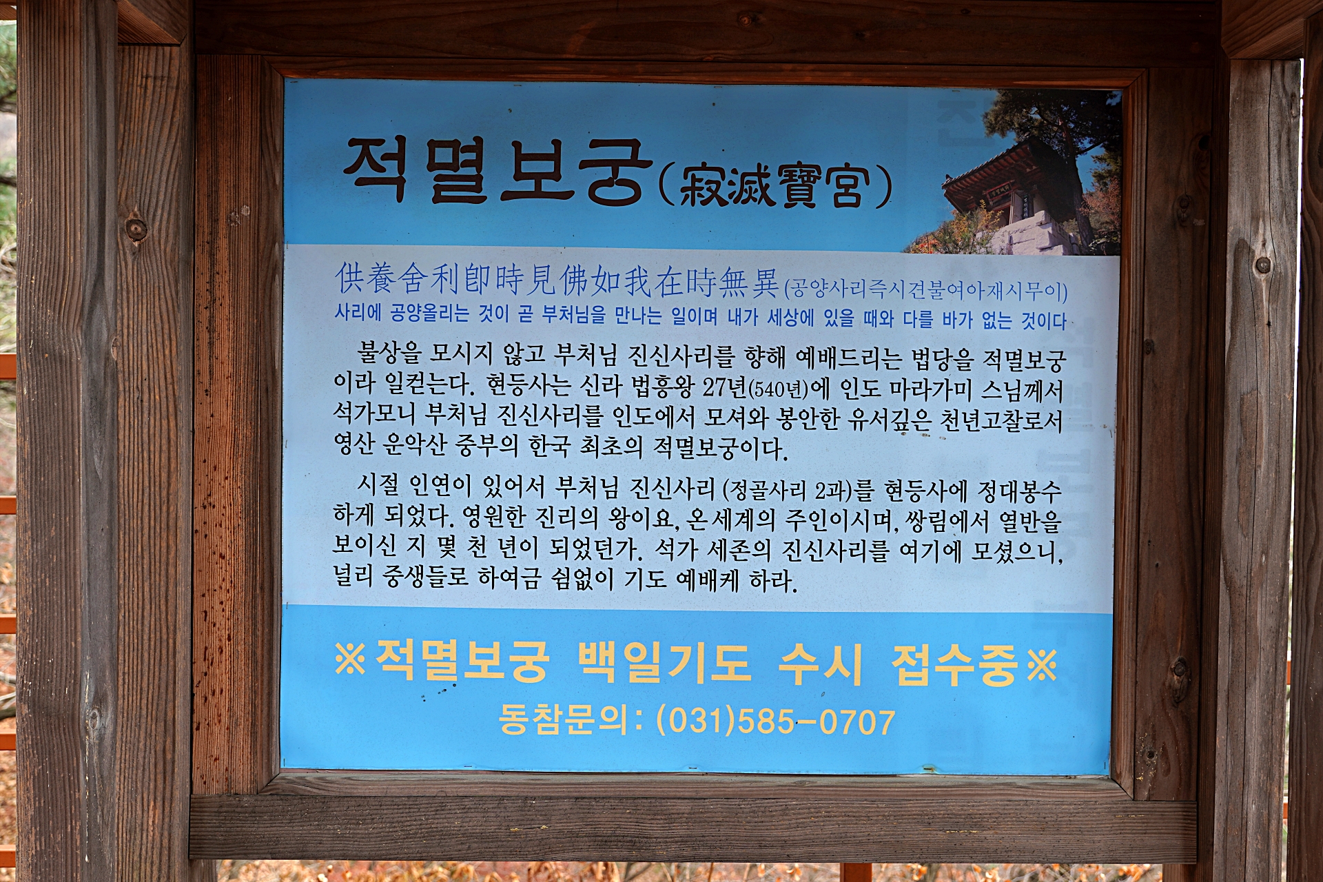 현등사는 석가모니의 진신사리를 모신 적멸보궁(寂滅寶宮)이다. 석가모니의 몸에서 나온 사리가 있으므로, 불상을 봉안하지 않고 불단만 있는 것이 특징이다. 전국에 적멸보궁이 몇 개인지는 정확히 모르겠지만 10개 이상은 되는 듯하다.