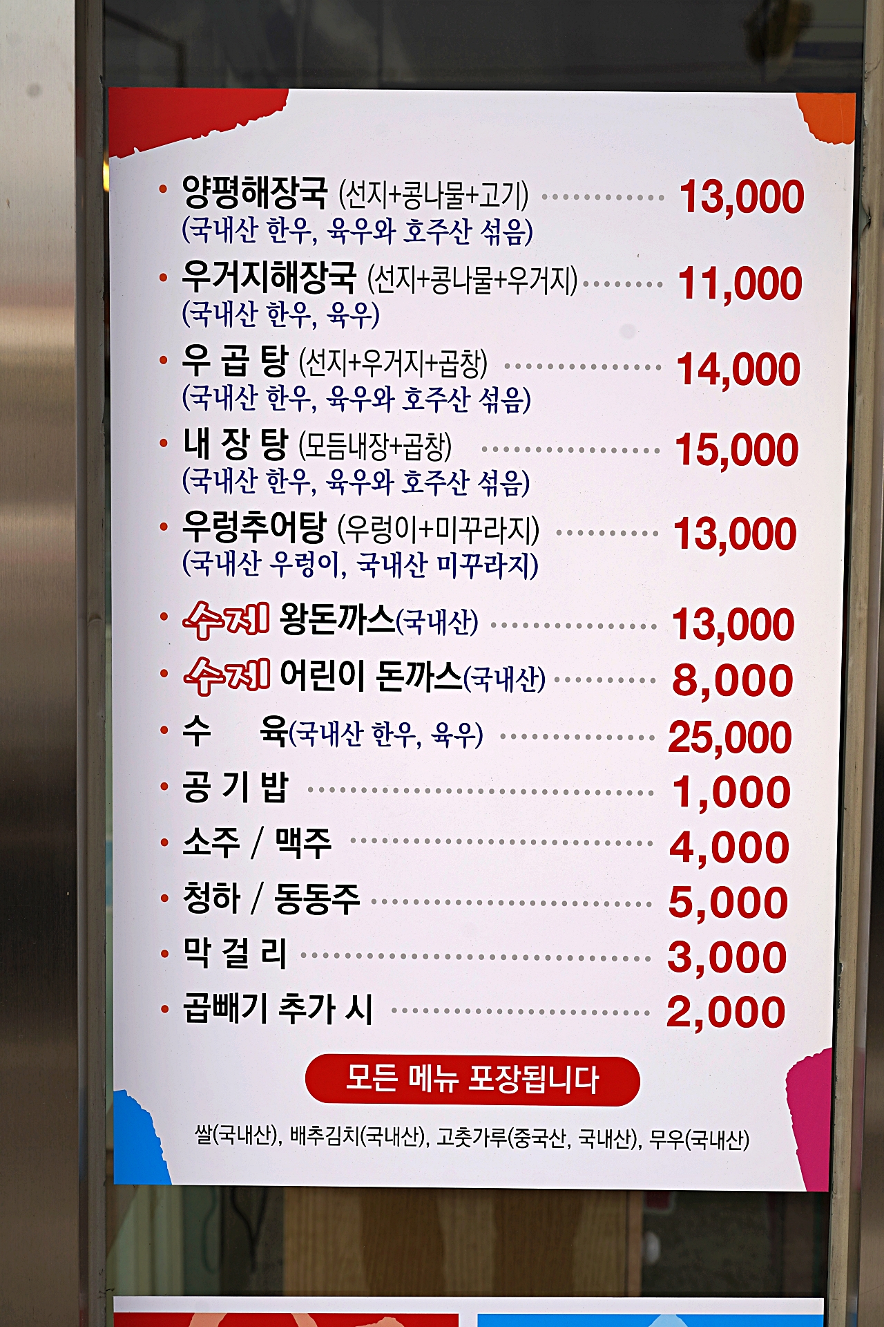 먹는 걸 좋아하는 와이프의 비위를 맞추기 위해서는 먹거리를 잘 선택해야 하는데 입구에는 들어 갈 만한 식당이 보이지 않아 서울로 돌아오는 길에 양평해장국집으로 들어 갔다. 원조라는 단어가 여기저기 붙어 있어 어느 가게가 진짜 원조인지는 알 수 없지만 맛은 괜찮았다.