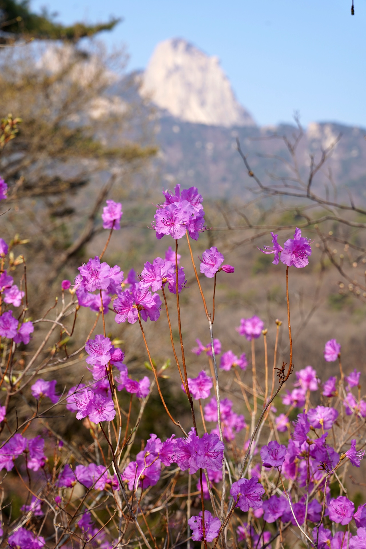 진달래가 만발하는 4월이 되면 습관처럼 찾는 곳이 있다. 바로 북한산 진달래능선이다. 타오르는 분홍빛 불꽃처럼 강렬한 아름다움을 선사하며, 북한산에서 유일하게 대규모 진달래 군락을 볼 수 있는 능선이다. 또한, 진달래를 배경으로 삼각산의 은은한 자태를 함께 감상할 수 있는 독보적인 조망처이기도 하다.