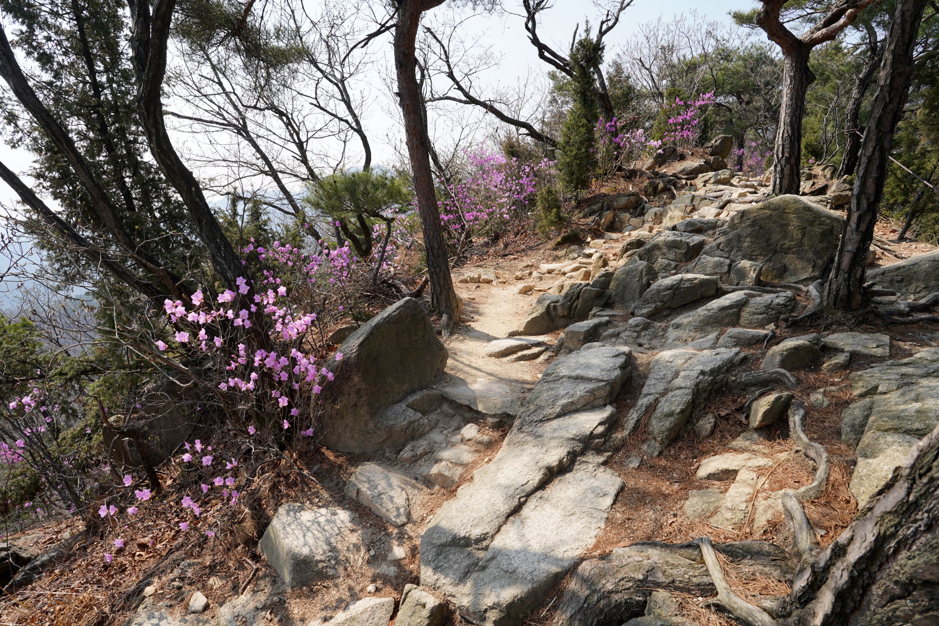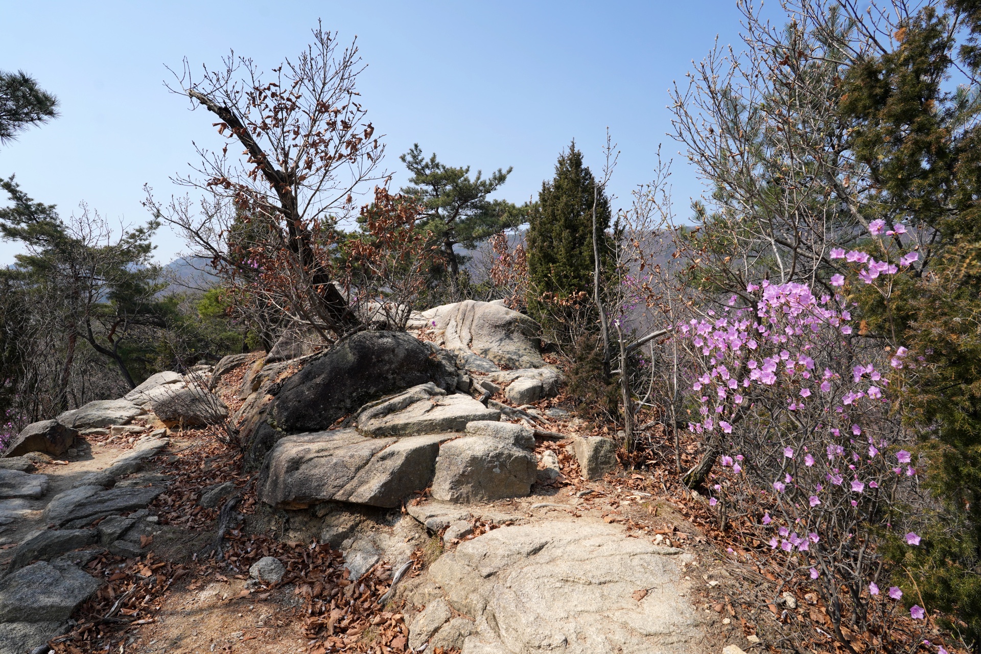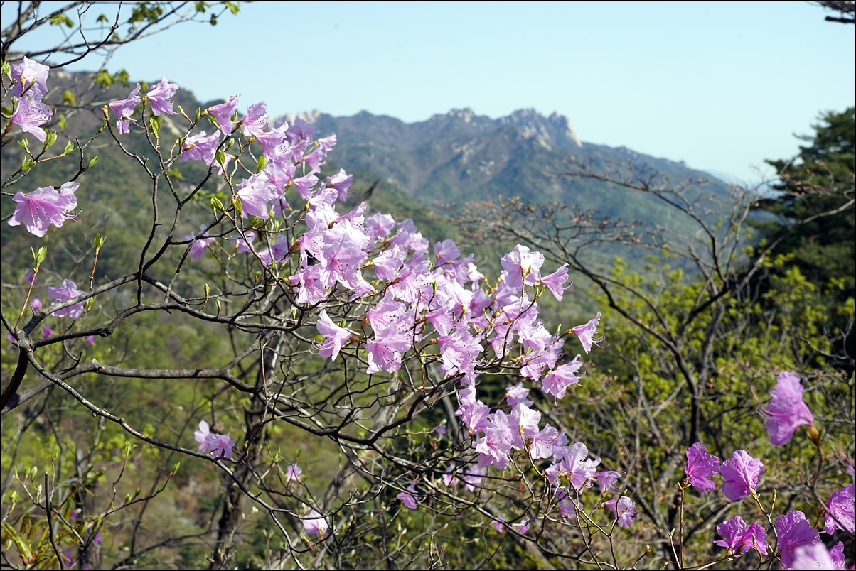 능선 중간중간 삼각산의 세 봉우리가 정면으로 보이는 지점은 최고의 포토존이다. 거대한 암봉과 분홍빛 꽃이 대비되는 풍경을 카메라에 담기에 더할 나위 없이 좋다. 하지만 이번 산행에서는 오른쪽으로 펼쳐지는 세 봉우리의 조망처를 유심히 살폈음에도 사진 찍을 만한 곳을 찾기가 쉽지 않았다. 그사이 나무들이 훌쩍 자란 탓인 듯하다.