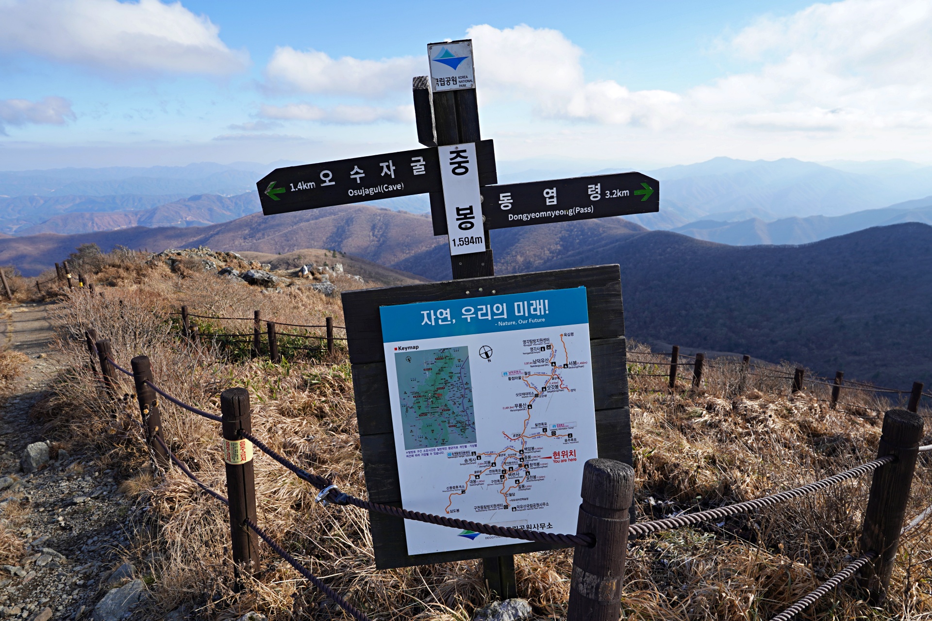 덕유산 중봉(1,594m)은 향적봉에 이어 두 번째로 높은 봉우리다. 향적봉과 남덕유산을 잇는 주능선의 중심축 역할을 하기에 '중봉'이라는 이름이 붙었다. 이곳은 계절마다 옷을 갈아입는다. 여름에는 노란 원추리 꽃이 만개해 '천상의 화원'을 이루고, 겨울에는 눈꽃과 상고대가 어우러져 절경을 선사한다.