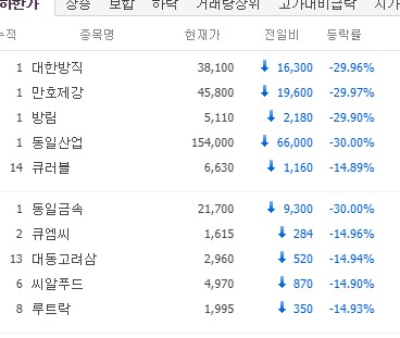 동일산업, 동일금속, 만호제강, 대한방직, 방림 등 5개 종목이 의문의 하한가를