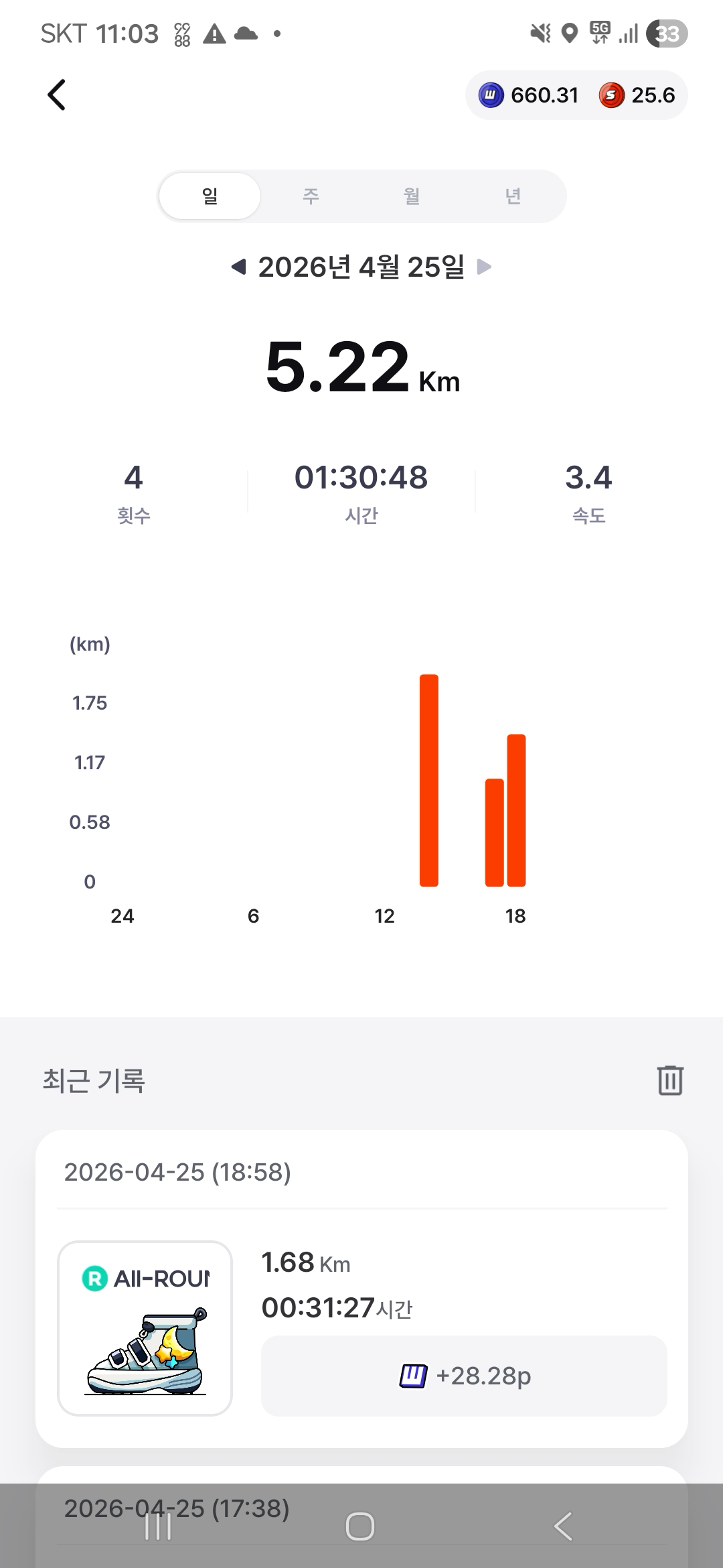 [M2E#695] 2026-04-25 오늘의 운동 완료(5.22/5) - Today's workouttalkit (71)in #kr • 3 days ago 안녕하세요 가야태자 @talkit 입니다. 오늘도 운동완료 했습니다. 낮에 뭐좀 만들어 보려고 코 워크 센터에 갔습니다. 거기서 좀 만들고 집에 와서 일단 기본 프로그램은 완성 했네요. 왕복 하니까 5km이네요 감사합니다. Posted using SteemX #kr-m2e #talkit #exercise #stepn #stepn-kr #workout