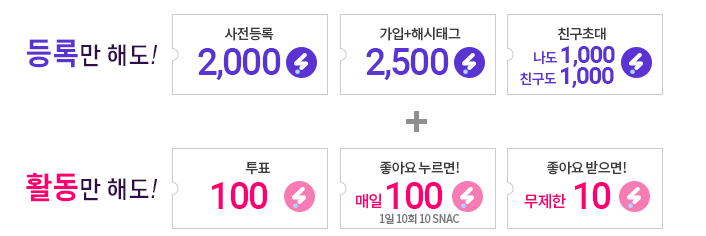사전등록, 가입시 해시태그등록, 친구까지 초대하면 총 5,500 SNAC