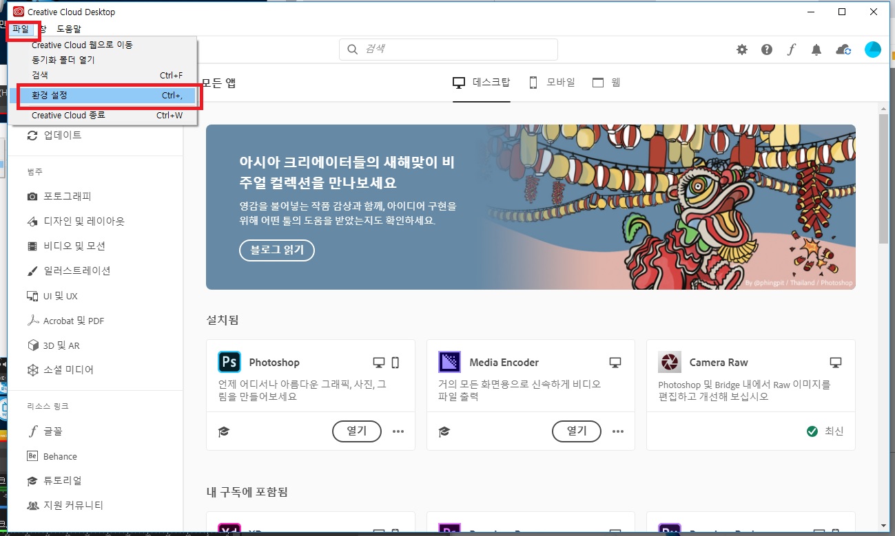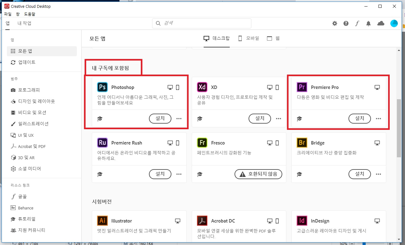 Creative Cloud Desktop 에서 쉽게 설치가 가능합니다.