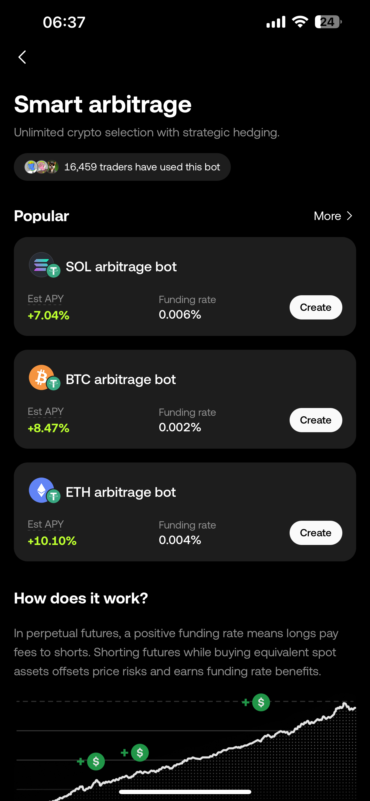 사용자는 특정 암호화폐(예: SOL, BTC, ETH)에 대해 차익거래 봇을 생성하여 자금 조달율(Funding Rate) 차이를 이용한 수익 창출을 목표로 합니다.