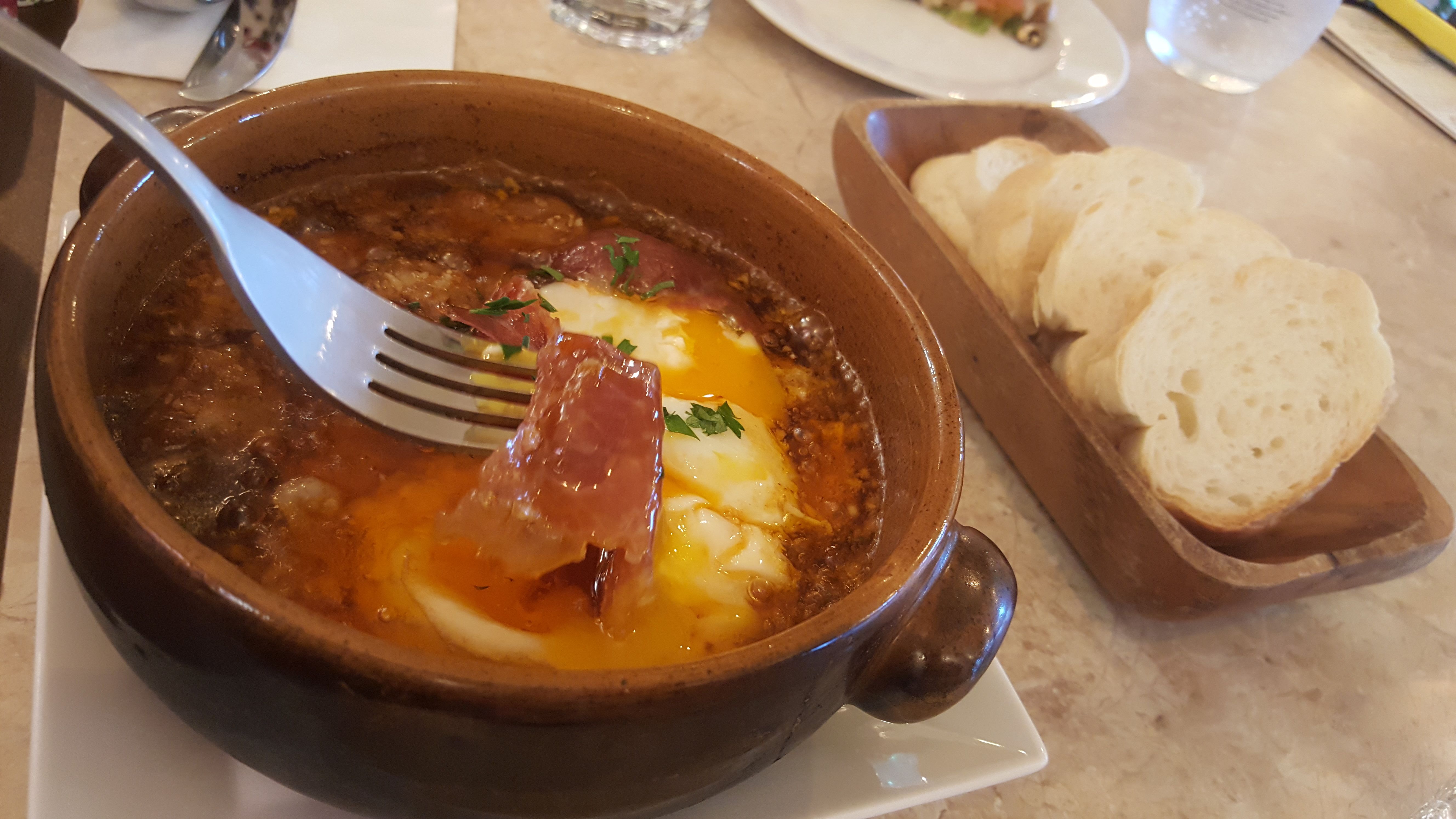 다음 메뉴는 "우에보 아 라 플라멘챠".. 이름이 어렵네요;;;; 에피타이저로 하몽이 들어간 계란요리인데 빵과 같이 나옵니다. 따뜻할때 빵 위에 살짝 올려서 같이 먹으면 맛있습니다. 사실 새우가 들어간 감바스를 더 좋아하긴 하는데 이건 갈때마다 먹었어서 다른 메뉴를 시켜봤는데 맛은 있었습니다. 다만 전 감바스(감바스 알 아히요)가 더 좋아요ㅎ
