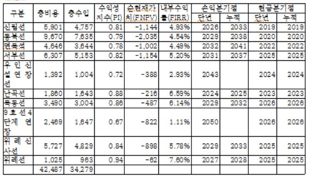 물론 공공교통이라는 것이 적자가 날 수 있고 그럼에도 불구하고 이를 지원하는 것이 필요하고 이것이 공공교통의 특징이다. 하지만 문제는 2013년 당시 서울시는 위와 같은 재무적 평가를 통해서 '재정사업은 힘들기 때문에' 민간사업자의 참여를 통한 민자사업을 한다는 논리를 만들었다는 점이다. 그래서 당시 민자사업의 B/C는 모두 1이 넘었다. 그런데 지금까지 우이선이나 신림선을 제외하고는 민간사업자의 참여가 전무한 상태다. 그러면 2013년 당시 서울시의 정책판단은 오류였다는 것이다.