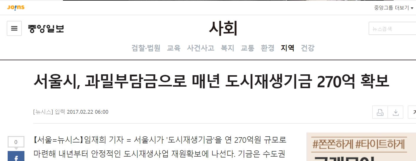 지나치게 고밀도 개발하는 사업자에게 부담금을 물어서 그로 인해 발생하는 도시문제를 해결하는 '원인자 부담의 원칙'에 따라 만들어진 과밀부담금은 연간 270억원 정도가 걷힌다. 문제는 이 용처가 이미 정해져 있다는 것이다. 서울시는 작년에 도시재생기금을 새롭게 만들면서 이의 재원으로 과밀부담금을 사용하도록 했다(https://news.joins.com/article/21292784).