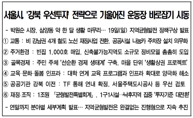 박원순 시장이 삼양동의 옥탑방에서 나왔다. 그러면서 예정했던 서울시의 강북 개발에 대한 비전을 밝혔다. 그동안 관심이 모여졌던 대책에 언론들의 관심이 집중되었다. 서울시에서 발표한 보도자료는 16쪽이 이르는 방대한 양이다. 그런 점에서 어떤 세부 대책에 언론들이 주목했는지를 짚어 보는 건 의미가 있겠다.