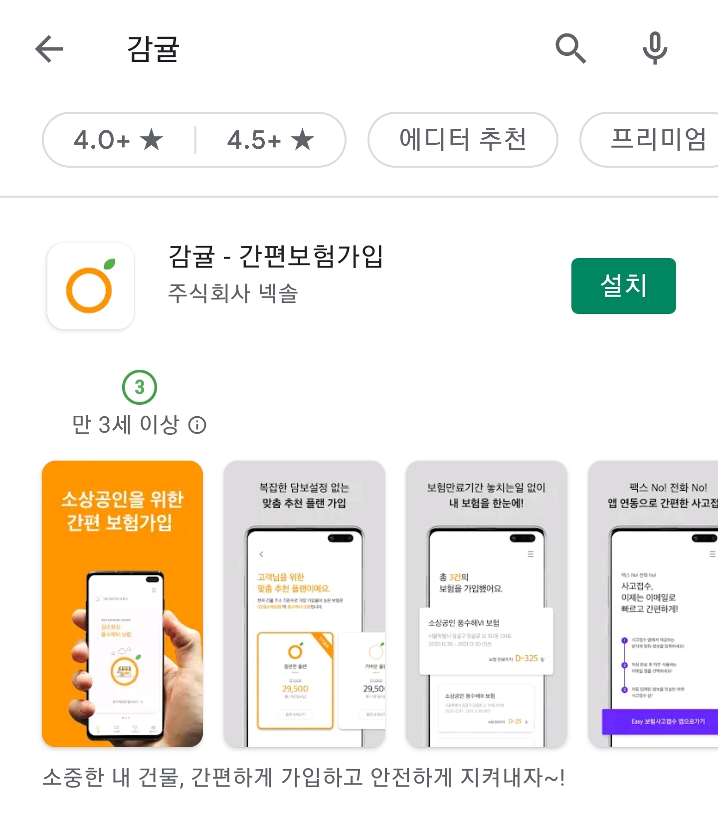 간편보험가입 앱 '감귤' 2탄valueablein (25)in #kr • 5 years ago (edited) 안녕하세요 @valueablein 입니다. 지난 글에서는 풍수해보험 소개와 감귤을 이용한 보험료 계산과정까지 소개해드렸는데요. 이전글 - 소상공인분들! 풍수해보험 가입 감귤로 도와드립니다 오늘은 간단한 비교 영상을 준비했습니다. 직접 걸리는 시간을 비교해보니 차이가 확연히 나죠. 영상처럼 빠르게 보험가입을 할 수 있는 이유는 첫번째, AI 기술 적용 인공지능을 활용하여 많고 많은 보험 단계들을 크게 [설계-청약-결제] 3단계로 나누어 복잡한 절차를 확 줄였습니다. 두번째, 빅데이터 활용 공공 Open API, 지역정보, 트렌드 등의 정보를 이용하여 기존에 입력하던 건물구조, 급수, 담보 등의 정보를 입력할 필요없이 주소만 입력하면 보험료가 자동으로 산출됩니다. 곧 만날 수 있겠죠? 오늘은 여기서 글을 줄이며 다음엔 어떤 주제로 돌아올지 기대많이 해주세요~