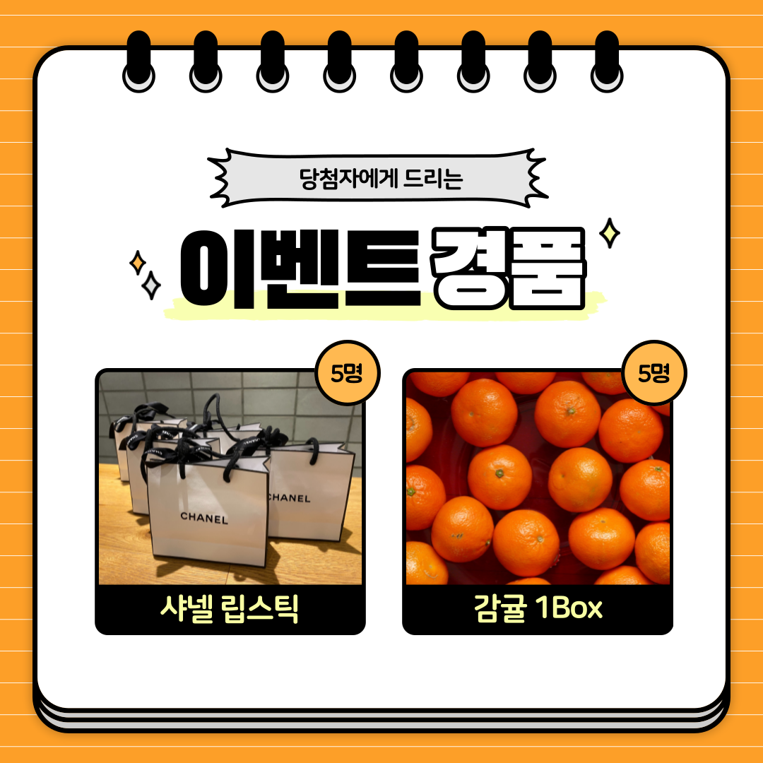 샤넬 립스틱 5명, 감귤 1Box 5명. 총 10명에게 경품을 드립니다 .