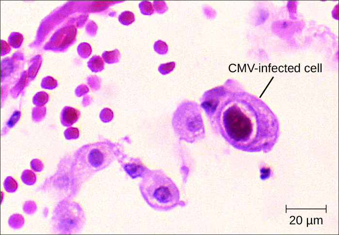 Cells infected with CMV become enlarged and have a characteristic “owl’s eye” nucleus. This micrograph shows kidney cells from a patient with CMV. (credit: modification of work by Centers for Disease Control and Prevention)