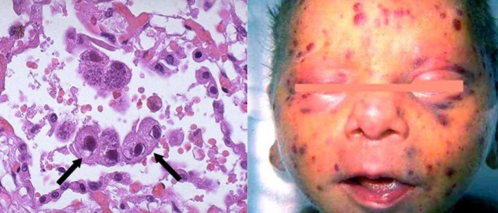 Owl-eye inclusions by HCMV in the lung tissue (좌), 블루베리머핀 베이비 by HCMV (위) David Clark, MD