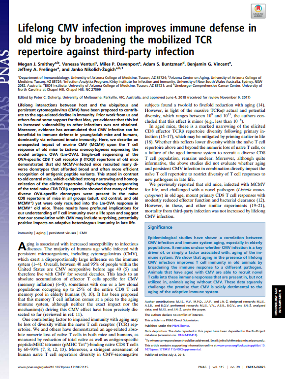 실험군과 대조군에서 T-cell의 다양성은 비슷했습니다. 그러나 외부에서 새롭게 투입된 병원균에 대한 방어 능력은 HCMV를 지닌 실험군에서 더 높게 나타났습니다. 왜 이런 경향을 보이는지에 대한 분자 생물학적 메커니즘은 보여주지 않았습니다만, 잠복 감염한 바이러스가 후천성 면역(adaptive immunity)을 증강 시켜 숙주의 방어 시스템을 건강하게 만들 수 있다는 새로운 페러다임을 제시했다는 의미가 있습니다.