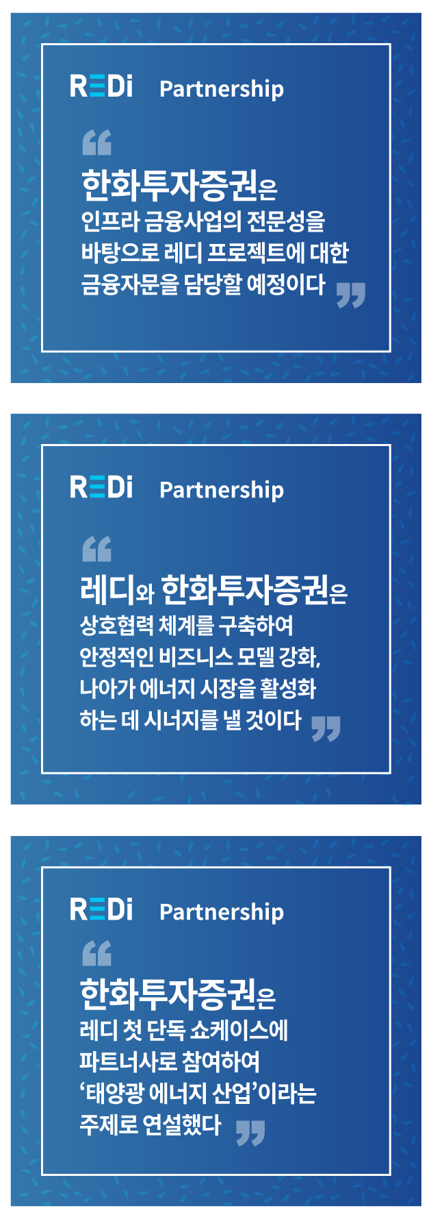 신재생에너지 글로벌 데이터 플랫폼 레디(REDi) 가 한화투자증권과 MOU 를 체결했네요.