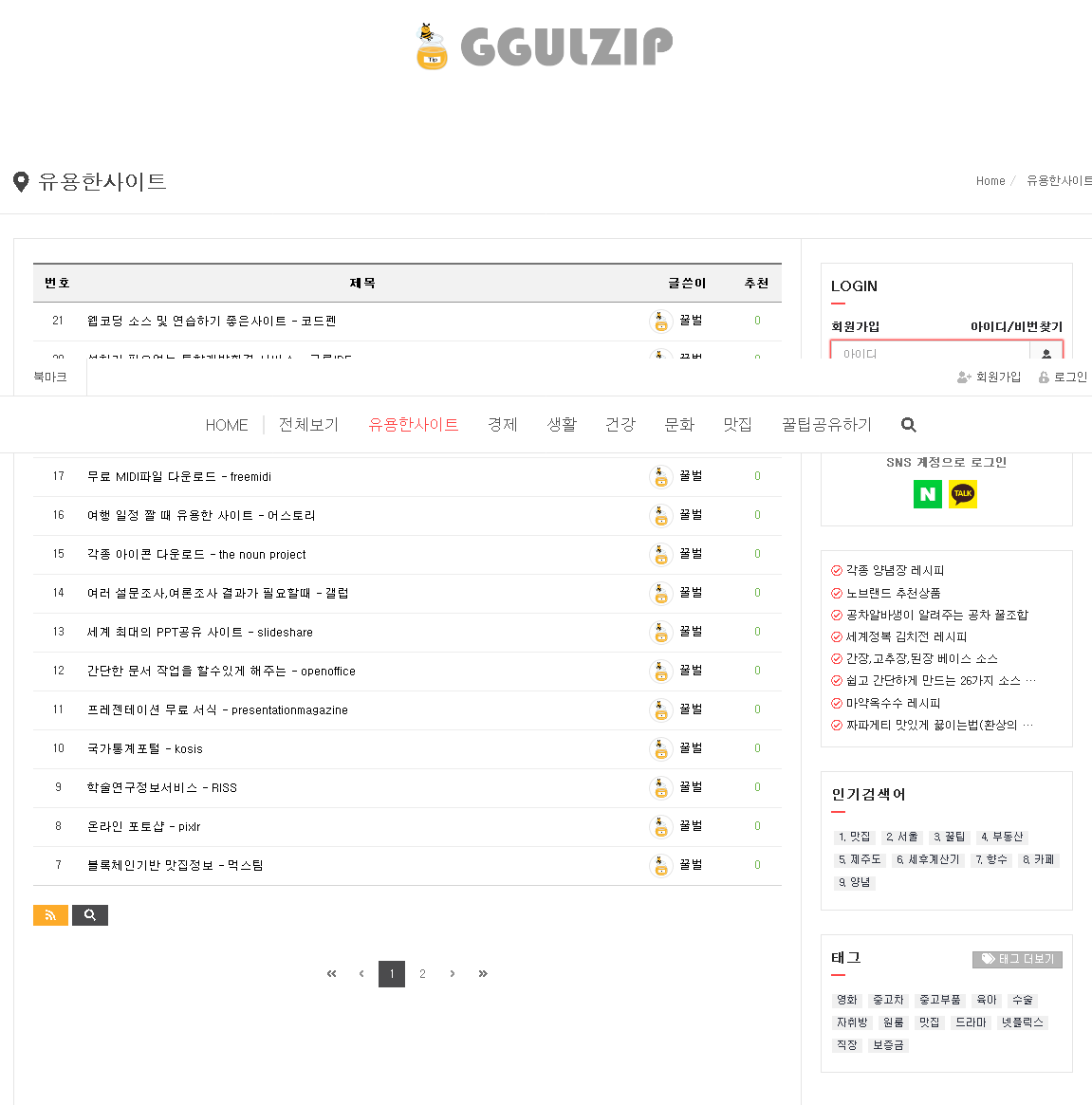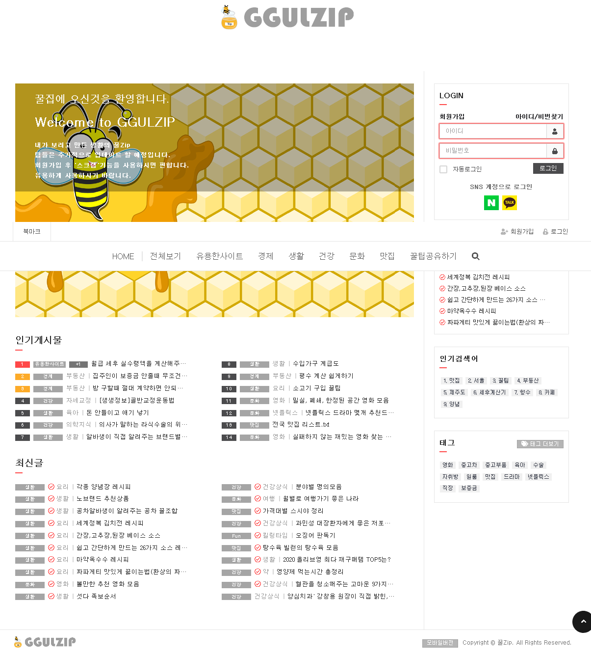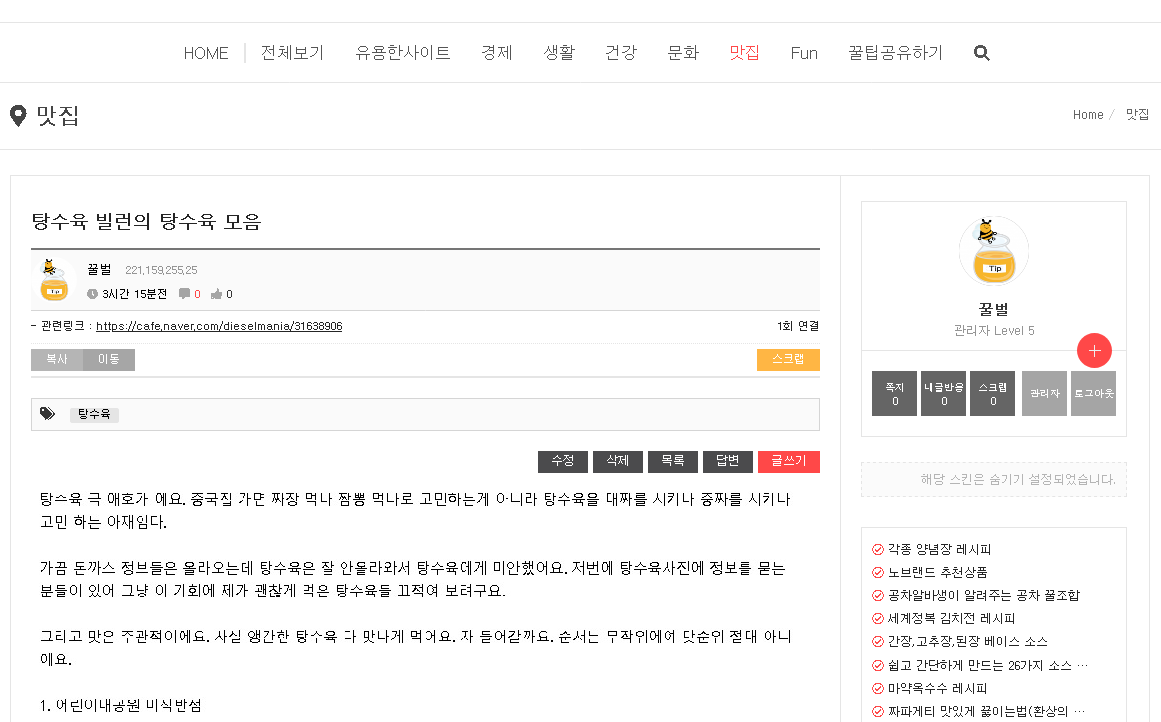 내가 쓰려고 만든 "꿀zip.kr"공유합니다.wonki33 (55)in #kr • 6 years ago 꿀집 http://ggulzip.kr 각종 커뮤니티나 인터넷에 돌아다니는 꿀팁들 정리해서 보려고 만든 사이트입니다. 사용법은 뭐 딱히 없구요 회원 가입하시면 '스크랩'기능 사용이 가능합니다. 가입하시고 쓰시면 조금더 편하실 거에요
