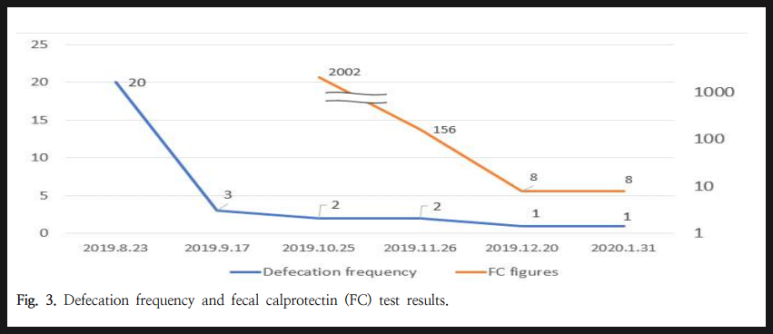 FC수치(Fecal Calprotectin, 분변 칼프로텍틴) 수치가 감소하였고, 대변 횟수, 양상, 복통의 주요 증상도 호전되었습니다.