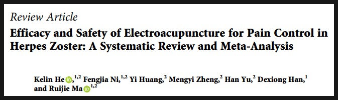 2.He K, Ni F, Huang Y, Zheng M, Yu H, Han D, Ma R. Efficacy and Safety of Electroacupuncture for Pain Control in Herpes Zoster: A Systematic Review and Meta-Analysis. Evid Based Complement Alternat Med. 2022 Jul 4;2022:4478444. doi: 10.1155/2022/4478444(2021 IF 2.650).
