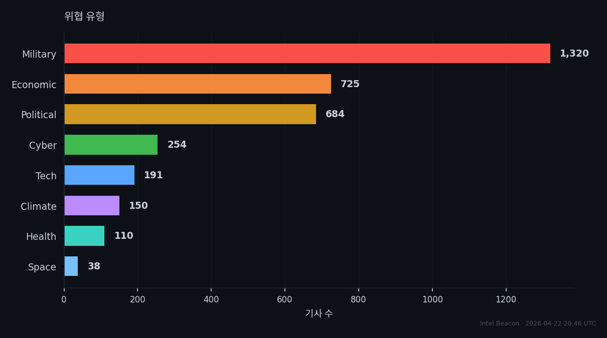 지배적 위협 범주인 군사, 경제, 정치 요인은 글로벌 안정성에 대한 지속적인 압력을 시사합니다.