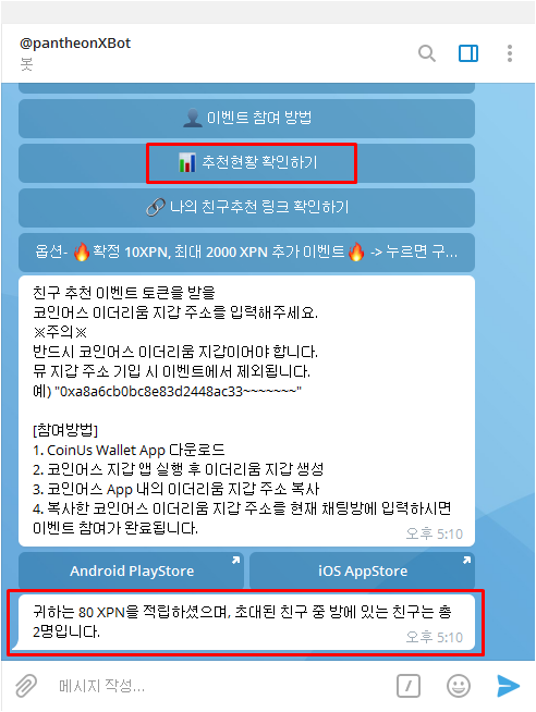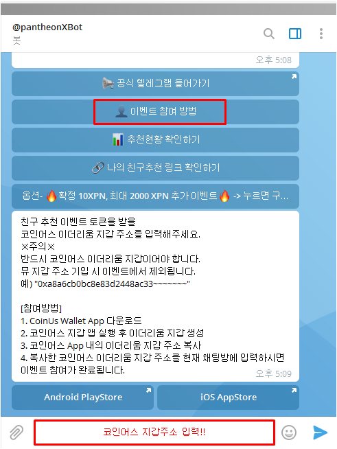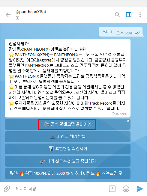 - 공식 텔레그램 입장후 pantheonX_kor_bot 다시 이동후
