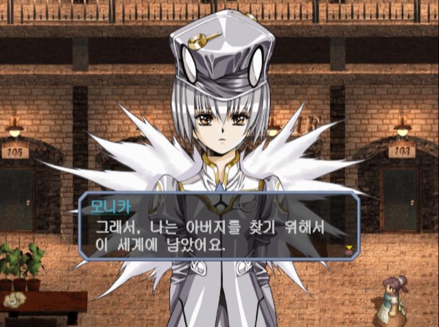 모니카 : 그것도 있지만 포니어에 살았던 것은 거기가 아버지의 집이었었고, 미쉘이 있었기 때문이에요. 사라진 아버지를 대신해 어머니는 혼자 힘으로 나를 키워주셨어요. 하지만 너무 무리해서 병이 나셨고 2년 전에 돌아가셨어요. 할아버지도 여행을 떠나버린 지금 나의 육친은 아버지뿐... 그래서, 나는 아버지를 찾기 위해서 이 세계에 남았어요.
