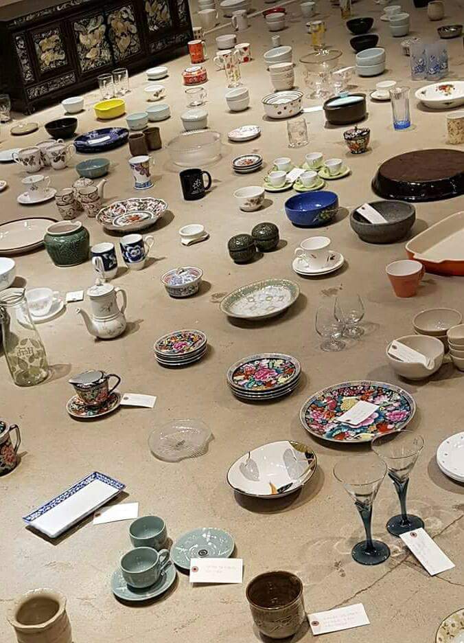 색유리 표면을 조각해서 만든 크리스탈 와인병과 잔에서부터 미제 파이렉스 접시, 중국식 다기세트, ‘홍장미 세트’라는 커피잔 세트, 스테인레스 그릇뿐만 아니라 락앤락 투명 플라스틱 밀폐용기와 원목 장식장까지 전시되어 있다.