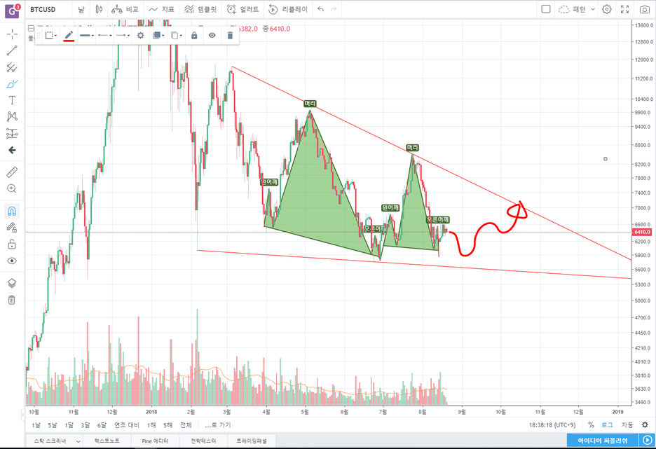 지키지 못한다면 하방으로 간다고 생각하시면 될 듯 하며 위 패턴 차트의 헤드 앤 숄더 넥라인을 지키느냐가 가장 중요할 듯 보입니다.