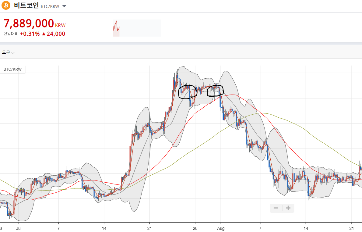 6월달 상승에서 보면 20일 이평선을 깨고 더 올라가지 못하고 나서 하락이 계속되었다.