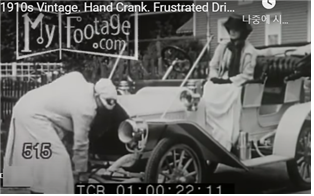 1910년대 내연기관차 오우너 드라이버 시동 풍경이다. 차를 운전하기 위해서는 반드시 본 넷을 열고 여러 번 시동을 걸기 위해 크랭킹을 했어야 했다. 내연기관 차량도 엔진이 점차 커짐에 따라 크랭킹 작업도 만만치 않을 정도로 힘이 드는 작업으로 보면 될 것이다.