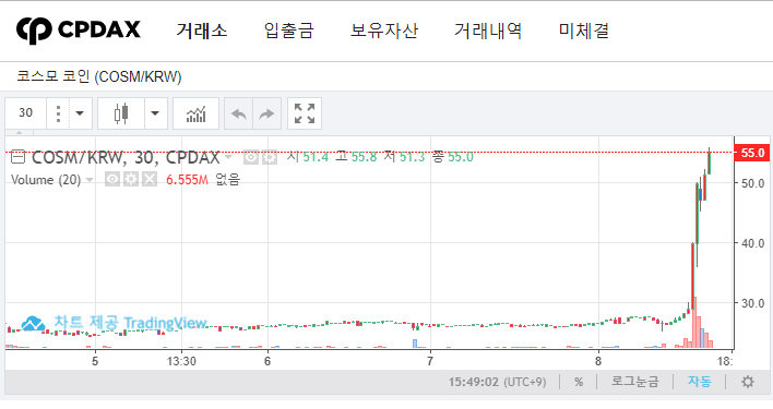 코스모 코인이 단번에 100%가량 상승해 버리네요!
