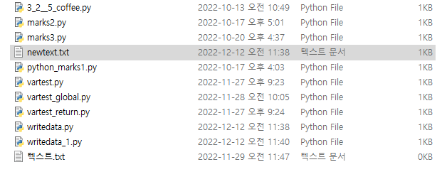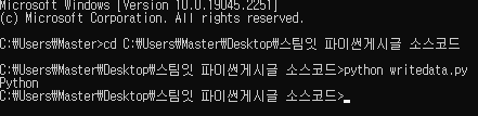 두 프로그램(소스코드)의 다른 점은 data를 출력하는 방법이다. 두 번째 방법은 우리가 계속 사용을 해왔던 모니터 화면에 출력하는 방법이다. 첫 번째 방법은 모니터 화면 대신 파일에 결괏값을 쓰기모드로 적는 방법이다. 차이점은 print대신에 파일 객체 f의 write함수 사용한 것 외에는 없다. cmd를 통해 첫 번째 예제를 실행해본다.